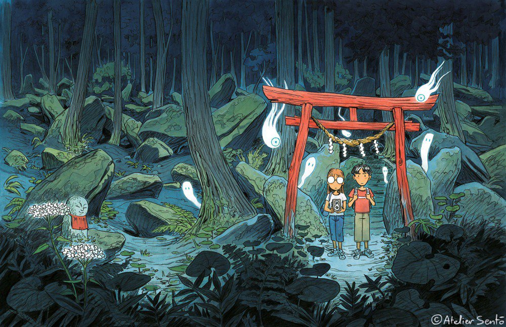 This semi-autobiographical story follows artists Cèline and Oliver, as they travel around the rural area of Niigata, Japan. On their journey, Cèline becomes enamoured by a large camera she finds at a local store, one with the ability to capture images of the spirit world. As they immerse themselves in the Japanese culture and environment, another coexisting world begins to manifest, one that strengthens with the village folklore. Even with only the slightest idea of this piece’s content, it should be very clear that the first thing to discuss about Onibi is its art. In fact, its cover page is what led me to purchasing it in the first place. Through the use of watercolours and pencils, the environment in this piece is given a refreshing glow. The drawings themselves aren’t the most detailed creations, but when met with exceptionally vibrant colours, a compelling experience is created. For example, when the reader, along with the protagonists, are gazing at the acres of rice paddies, we aren’t convinced by their realism. It’s not the drawing itself that makes us feel like we are there, it’s the feeling that seeps into us through the colours. Transportive art doesn’t necessarily have to be accurate in structure, rather, in the feeling it emits/evokes.