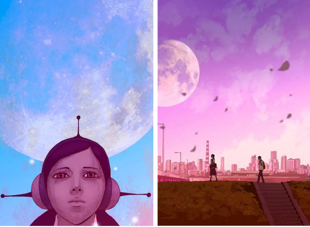 As someone who doesn’t read webtoons often (manga/manhwa published online as opposed to through magazines) I was blown away by the art. As this piece is published in full colour, a worry of mine was that the detail of the panels (why I fell in love with manga) would be sacrificed so that the illustrations harmonised with their colouring. But as someone unfamiliar with the usefulness of coloured comics, I was met with a breathtaking experience. The author not only picked colours that were aesthetically pleasing, but have the ability to flesh out everything they touch without verba; expression. The blue sky made up a majority of the artwork in this piece, giving it a warm, almost nostalgic feeling of high school life and summer days. When the sky would switch to purple, a surreal, dream-like state would wash over its readers. Most of the futuristic scenes took place in this lighting, adding to these highly complex scenes while acclimating readers to the setting. The panels that looked as if they were vibrating were a new experience for me, and I very smart way of portraying motion while simultaneously building tension. The shots of our protagonist running through the city, next to the only other robot in this setting was highly symbolic, and a great way to sign-post his development without explicitly telling us.