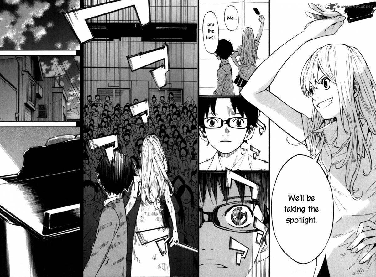 The most explored aspect of this manga was the purpose of music, and how it could both mend and tear one apart. The reader jumps between carefree attitudes surrounding a school setting to the cut-throat mindset of the musical industry. Using a strict musical competition as the backdrop acted as another aspect of how our character developed. It affected their growth as musicians, but also their relationship with their instruments. While Kousei has grown up learning how to play the piano to win competitions on account of his incredibly strict mother, this play-style gradually leads him away from music after having his breakdown.