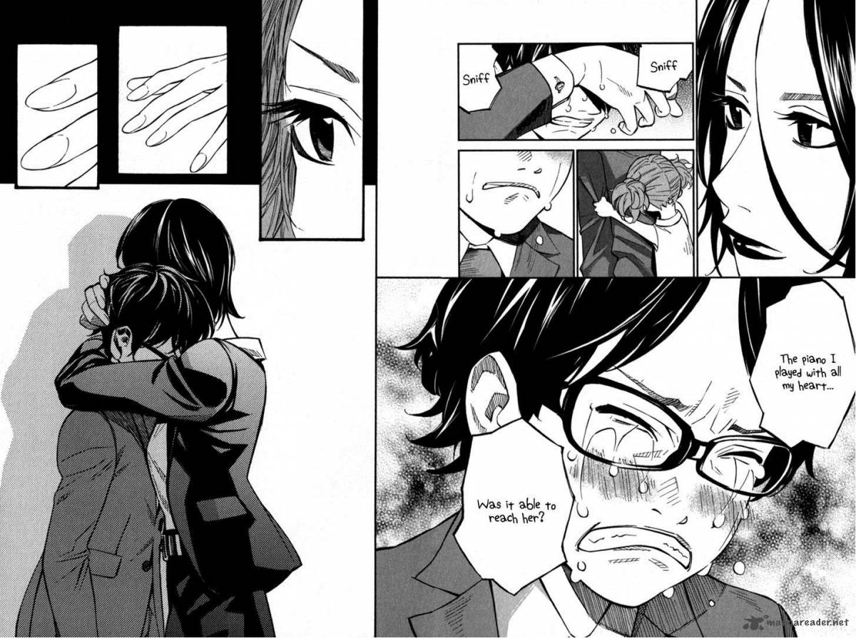 Whenever I read a manga based on music, I often wonder how it would have affected the piece if it were constructed in another medium. Personally, I don’t think this manga suffered too much from it. In manga like Beck, for example, it would be important to hear the music in order to track the protagonist’s development from amateur musician to rock star. However, Your Lie in April seems more focused on the actual competitors, and the time they’re having on stage rather than anything else. We don’t necessarily need to listen to the music (though it would be helpful), to understand why the audience are moved, or why our protagonist is weeping tears of happiness.