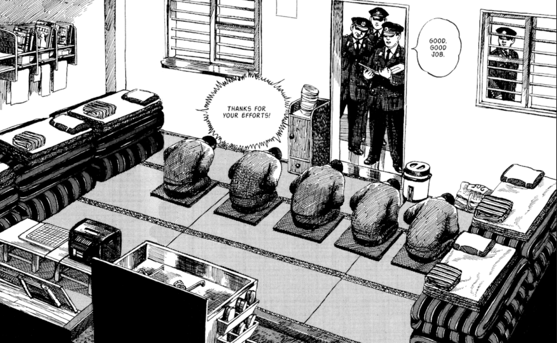 It was uncomfortable watching the protagonist joke around with murderers about their crime, and I wasn’t sure if the purpose of it was to humanise jailbirds or show the necessity to strike alliances with certain characters. Though, I wouldn’t say it creates empathy, as Hanawa provides no instances of repentance, and constantly rests on this description of prisoners being “pigs oblivious of the outside world”.
