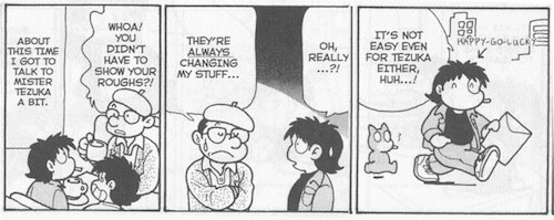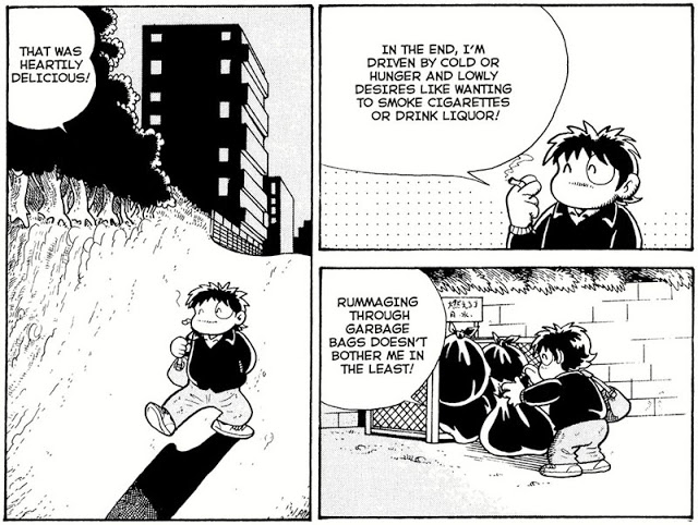 “Walking around town” set in 1992, has similar beginnings, however documents and extended period of Azuma absence. Interestingly, during this time the author gets a job at a construction company, laying pipes, and instead of focusing on food, there is a nice balance between descriptions of his work life and the characters that surround it. As Azuma rarely reflects on himself, it was refreshing having characters with actual personalities we could gauge and read around. And, while he never goes into detail about it, it was interesting watching Azuma reinvent himself instead of spending months-to-years living off of garbage scraps. The fact that he seemed to find some happiness from the life of a labourer, more so than a manga artist, leads to several questions about the pressures of a mangaka, and the ideal way in which we should live.