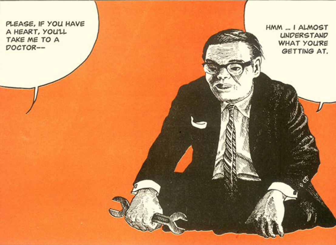 If anything, this article on Tsuge’s piece embodies feelings I’ve had over the last year, where I’ve spent a majority of time reading alternative manga, particularly relating to the “Gekiga” (“dramatic pictures”) movement. “Screw style” is a surrealist one-shot about a young man who is bitten by a jellyfish while at the beach. The bite pierces his artery, and he travels through a decaying post-war setting in search of assistance. He finally finds a female gynaecologist, who performs and experimental operation on him.