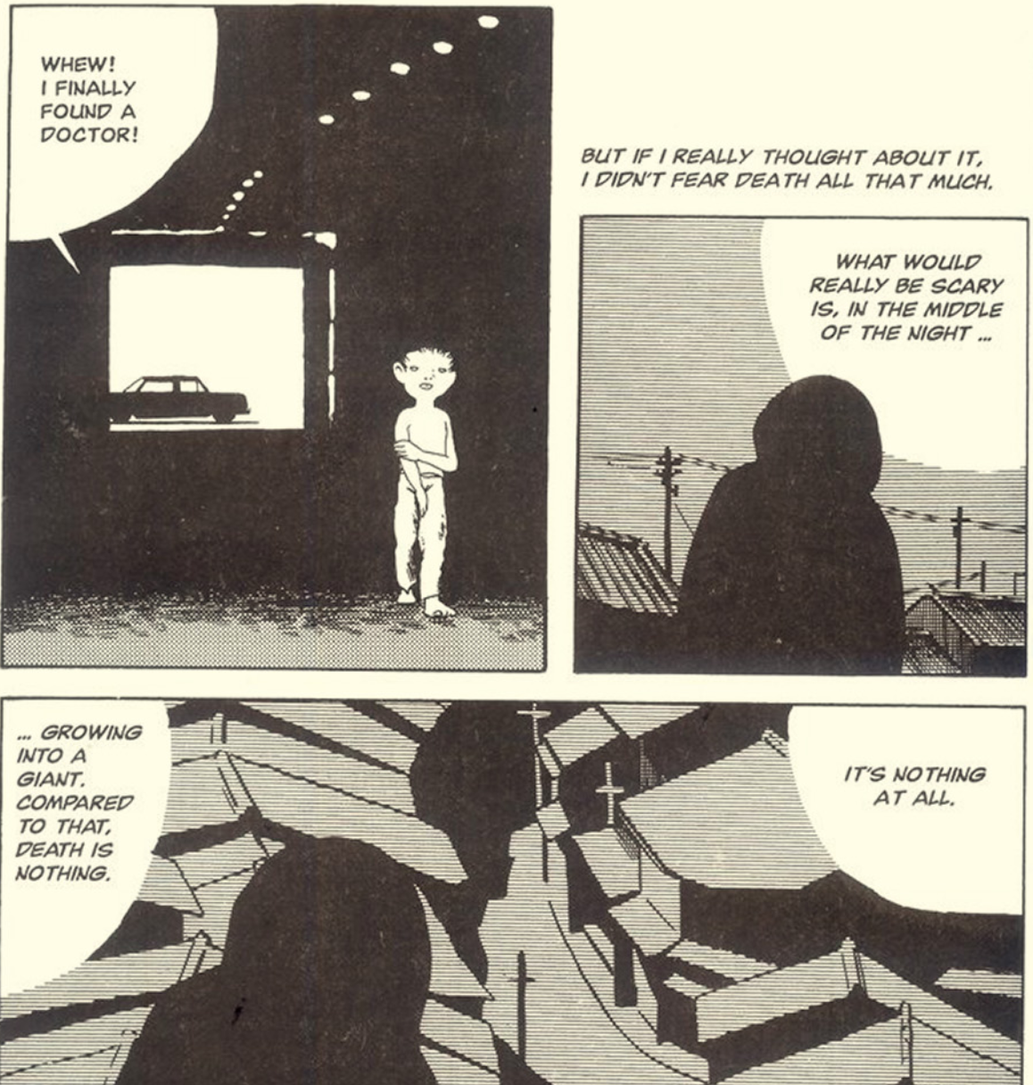 The passing plot points flow like a stream-of-consciousness, disjointed, though interconnected through what feels like our protagonist’s dream-like state. The complete lack of progression, and varying levels of urgency in our protagonist clouds the reader’s perception of the situation, and, if we deduce the jellyfish bite was poisonous, may suggest the protagonist shares the same hallucinogenic visuals we experience. Tsuge has said in interviews that this story came to him in a dream while napping on the roof of his apartment building, and the trance-like state our protagonist wanders in may have been an attempt to recapture said experience.