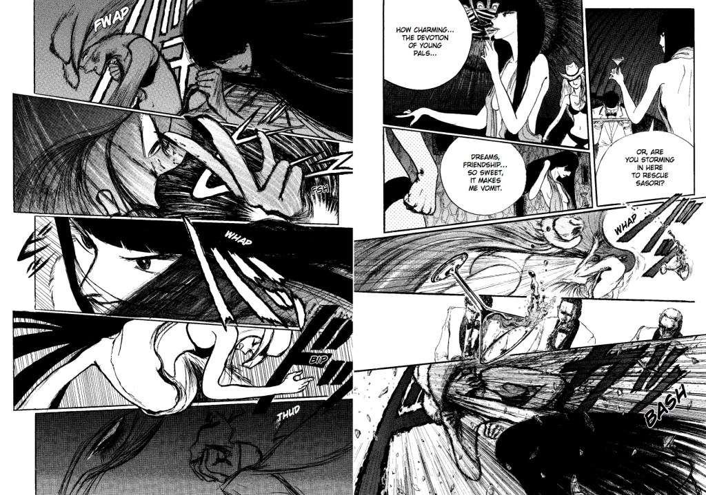 Nothing can impede on Yoshimizu’s artistry. The use of a sketchy aesthetic complimented his gritty story, and even added to the constant motion being depicted. It wasn’t one particular style that added substance to this series, but Yoshimizu’s ability to transition seamlessly between multiple in order to jar the audience. During stationary moments, realistic drawings appear in Yoshimoto’s sketchy backgrounds, yet the focal character in each panel remains clear, and unabashedly manga-like. Reality is never disregarded, but intelligently bent to create sensations. Yoshimizu not only varies his illustrative style between chapters, but within panels. This becomes most apparent when depicting battles, where all sense of clarity is removed from the choreography of the characters.