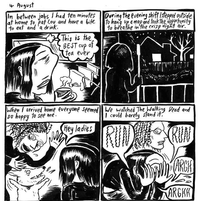 Ironically, it was these instances that added a source of enjoyment to the piece. The sagas of Mandy’s illnesses provided a continuity that made the comic more interesting at times, and broke the monotonous cycle the reader could find themselves in. The consistent rhythm of this piece meant every page had the same flow, which was sometimes too dreary. Other times I was truly immersed in her life, not realising a month of the narrative had gone by. This could be attributed to the mini sagas within a sea of mundane.