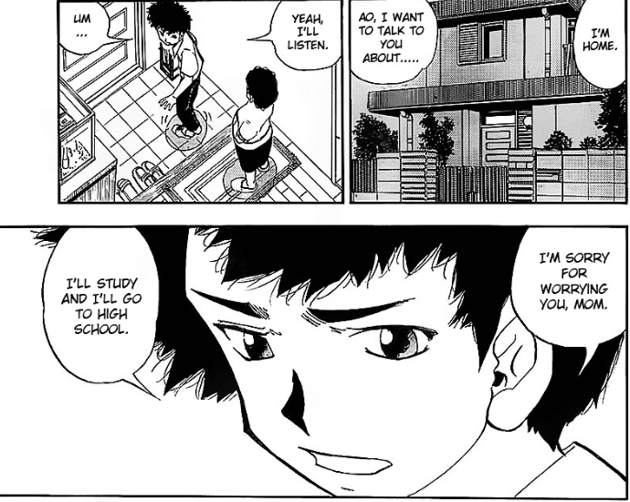 However, there was nothing new here. Each morsel of story, whether it be the angst of adolescence, the depressive themes or appeal to emotion has been done in other places, and done better. The best way to describe the concision of this manga is a car stripped for parts. What may have been seen as excessive features do, in many ways, improve the experience for the user. The way Ao slips into a negative mind-frame is justified by the tragedies he experiences, but his actual decent is somewhat humorous. For example, instead of working hard to get into a good high school, his struggles manifest into a hedonistic approach to living. This is shown through Ao hanging out with the school troublemaker, and engaging in… video games? Coping mechanisms come in many forms, but the way the scene transpires makes it look like Ao has just picked up a new hobby.