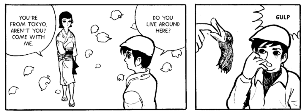 In the next story, Chirpy, Tsuge introduces another recurring theme in his work, the struggles of an artistic life, placed within a contemporary, but far from ideal Japan. In fact, Tsuge’s own career struggles drench each and every story. The pressure to produce accessible manga, as opposed to what he wants is linked to the imposter-syndrome discussed by the protagonist in The Phony Warrior, and the subjectivity of art analysis makes up the brunt of An Unusual Painting. Once again, Tsuge’s autobiographical approach elevates his work from that of his contemporaries.